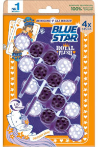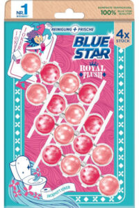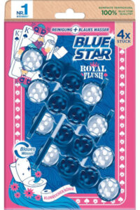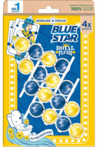 Die unterschiedlichen Varianten der Limited Edition „Klorreicher König“, „Dufte Dame“, „Blitzblanker Bube“ und „Jackpott Joker“ sorgen individuell für ein Frische-Duft-Erlebnis und reinigen die Toilette hygienisch sauber. Die Varianten mit Geruchsstopp-Technologie halten zusätzlich unangenehme Gerüche unter der Wasseroberfläche und färben das Wasser gleichzeitig in einen frischen blauen oder lila Farbton. Alle WC-Spüler der neuen Blue Star-Edition sorgen dank der bewährten Reinigungskraft mit der 4-fach Aktivstoff-Kombination für ein sauberes und glänzendes WC. Der Reinigungsschaum reinigt die Toilette intensiv, während die Anti-Kalk Formel Kalkablagerungen entgegenwirkt. Der Schmutz-Protektor schützt zusätzlich davor, dass neuer Schmutz wieder anhaftet und gleichzeitig sorgen die Kugeln für einen intensiven Duft – für eine langanhaltende Frische bis zu 250 Spülungen.