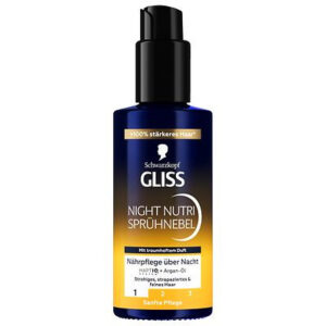 Schönheitsschlaf für das Haar? Die neuen Night Sprühnebel von Schwarzkopf GLISS sorgen für eine lang anhaltende Reparatur über Nacht, ohne das Haar zu beschweren, und sind ideal für feines Haar. Die zwei Varianten – GLISS Night Glanz Sprühnebel für Glanz und GLISS Night Nutri Sprühnebel für Nährpflege – mit Bonding HaptIQ System kreieren Mikrobindungen und stärken die Haarstruktur. Für +100 Prozent stärkeres Haar1 über Nacht, ohne es zu beschweren.